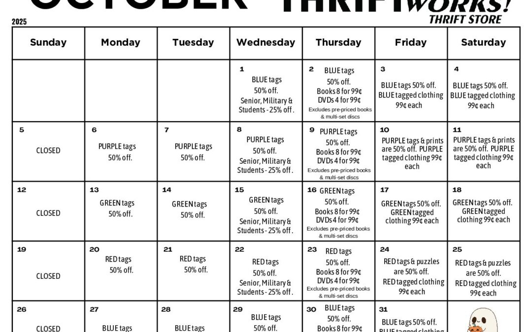 2025 WACOSA ThriftWorks Thrift Store Sales Calendar